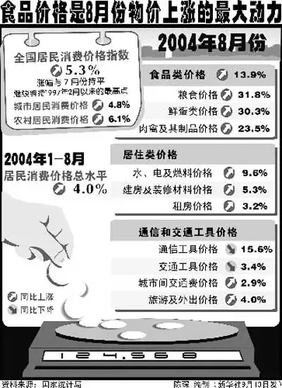 8月份,食品价格比去年同月上涨13.9%,是当月价格上涨的主要因素。其中,粮食价格上涨了31.8%,鲜蛋价格较上年同期增长了30.3%。居住类价格也上涨了6.0%。其中,水、电及燃料价格上涨9.6%,建房及装修材料价格上涨5.3%,租房价格上涨3.2%。